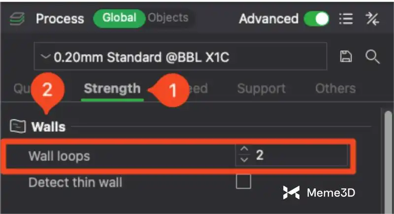 Trong Bambu Studio, bạn có thể truy cập tùy chọn Wall Loops (có sẵn trong tab Strength ), tùy chọn này đề cập đến các lớp ngoài cùng của vật thể được in, tạo thành lớp vỏ ngoài của nó.