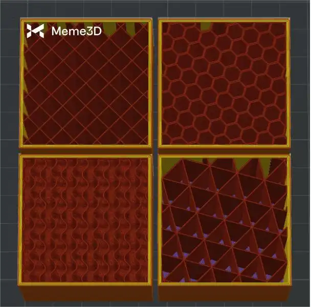 Mỗi kiểu cấu trúc đều có những đặc tính riêng biệt: ví dụ, kiểu tổ ong và kiểu xoắn ốc mang lại tỷ lệ độ bền trên trọng lượng tốt, trong khi kiểu lưới và kiểu tam giác cung cấp khả năng hỗ trợ cấu trúc đơn giản với tốc độ nhanh hơn.