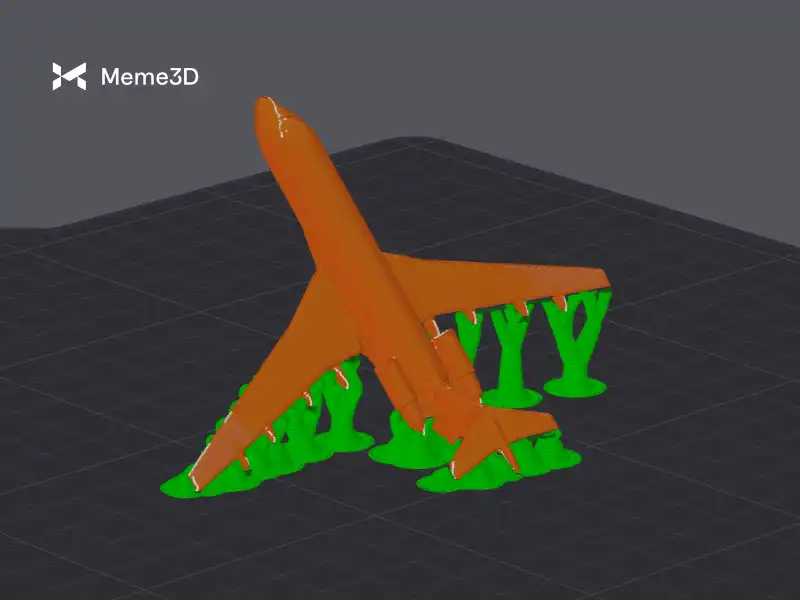 Trong hình ảnh bên dưới, mô hình được định hướng theo cách tạo ra chất lượng in không đồng nhất, với các đường lớp và yêu cầu vật liệu hỗ trợ tăng lên bên dưới mô hình. Do hướng định vị của mô hình, vật liệu hỗ trợ có thể làm hỏng mô hình và khiến việc loại bỏ trở nên khó khăn hơn.