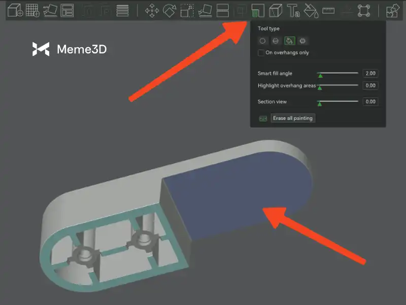 Một trong những tính năng hữu ích nhất để hỗ trợ in 3D trong Bambu Studio là Tô màu hỗ trợ (Support Painting). Với tùy chọn này, bạn có thể tô màu các phần trên mô hình nơi bạn muốn tạo ra cấu trúc hỗ trợ, trong ví dụ này, được đánh dấu bằng màu tím. Với Tô màu hỗ trợ, bạn có thể giảm thiểu lượng sợi nhựa cần dùng cho việc tạo cấu trúc hỗ trợ.