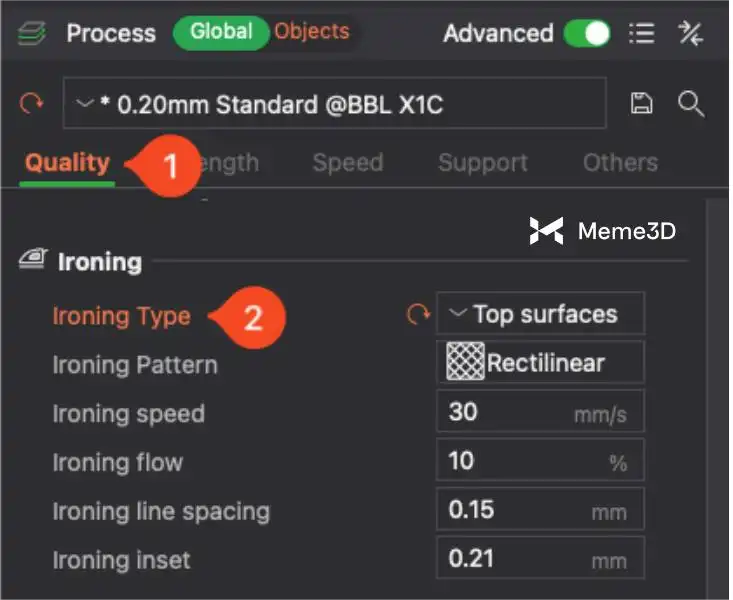 Bạn có thể điều chỉnh các cài đặt ủi trong Bambu Studio, từ tab Chất lượng.