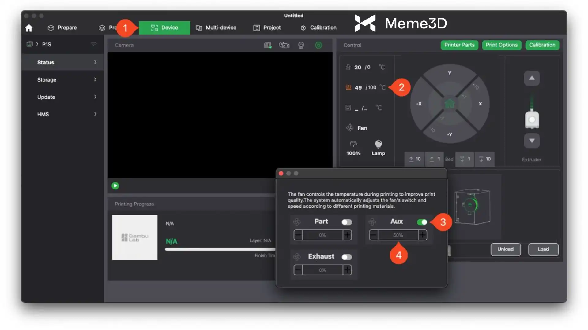 Để buồng in đạt nhiệt độ lý tưởng, hãy làm nóng trước máy P1S trước khi bắt đầu in. Chỉ cần đặt nhiệt độ bàn nhiệt ở 100°C , bật quạt phụ (quạt bên trong buồng in) ở mức 50% , sau đó chờ 15-20 phút . Bạn có thể dễ dàng thực hiện việc này từ Bambu Studio.