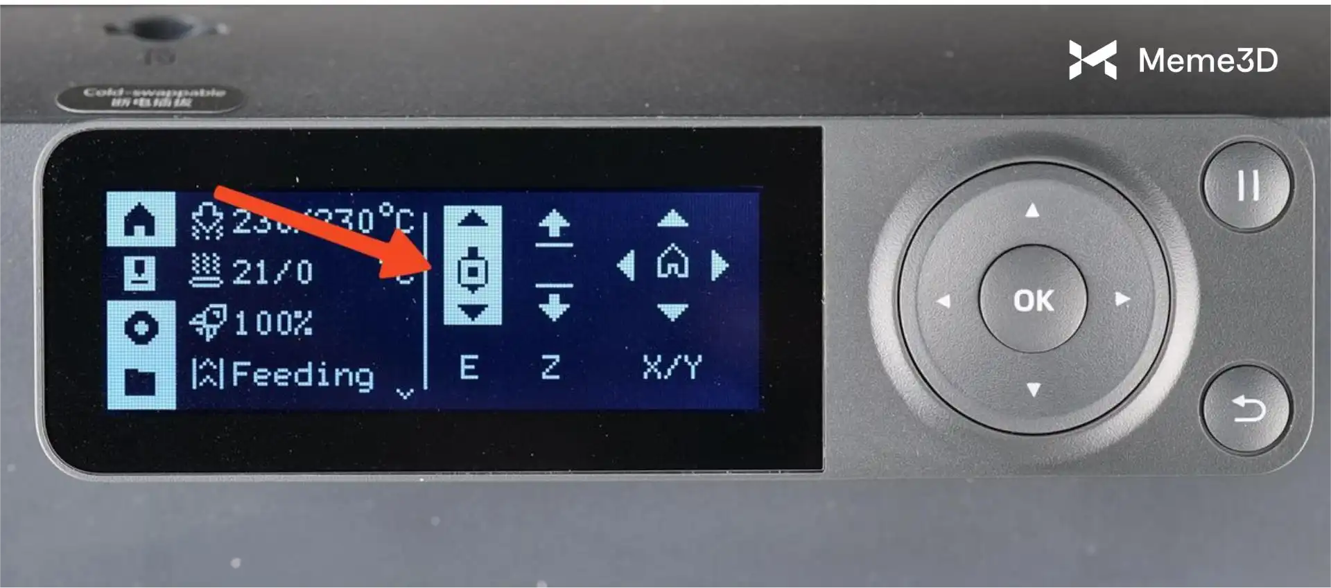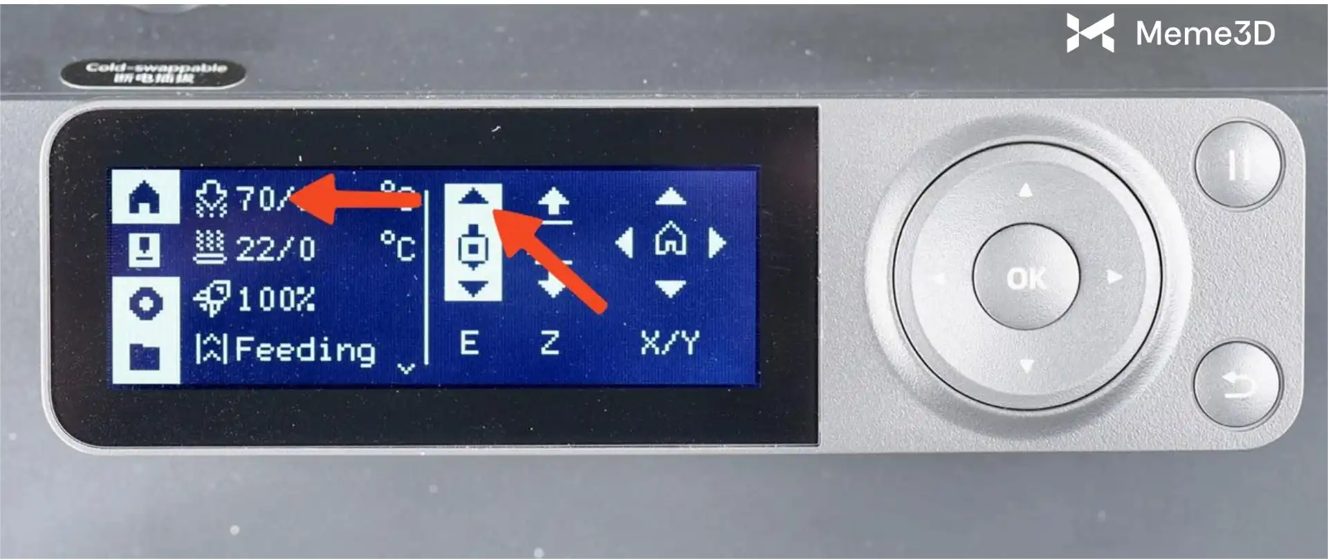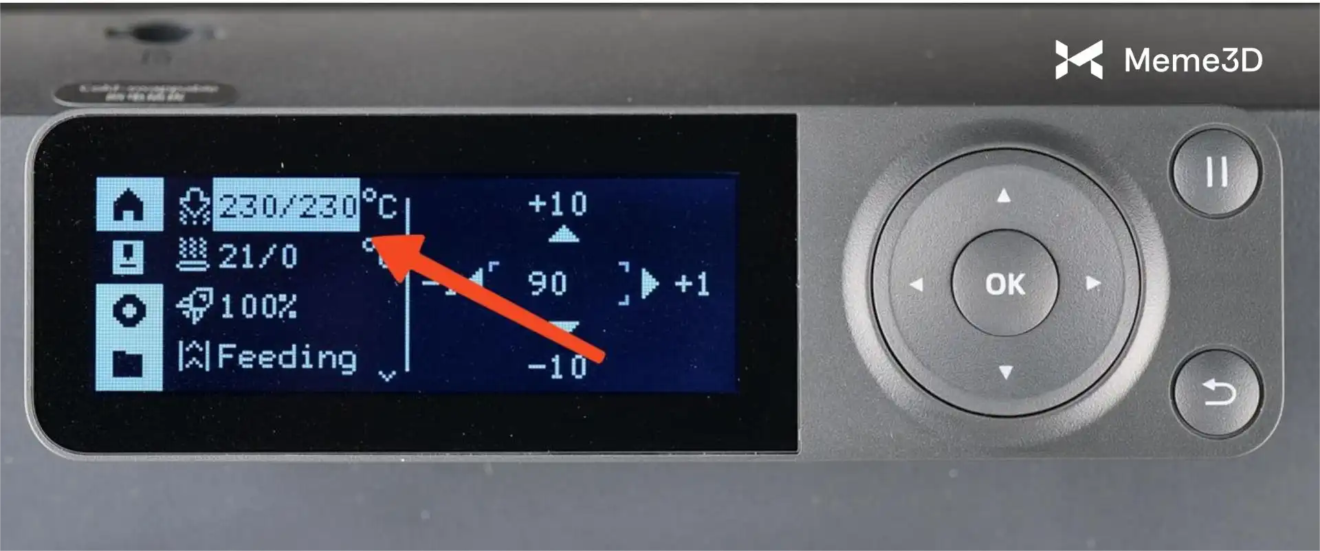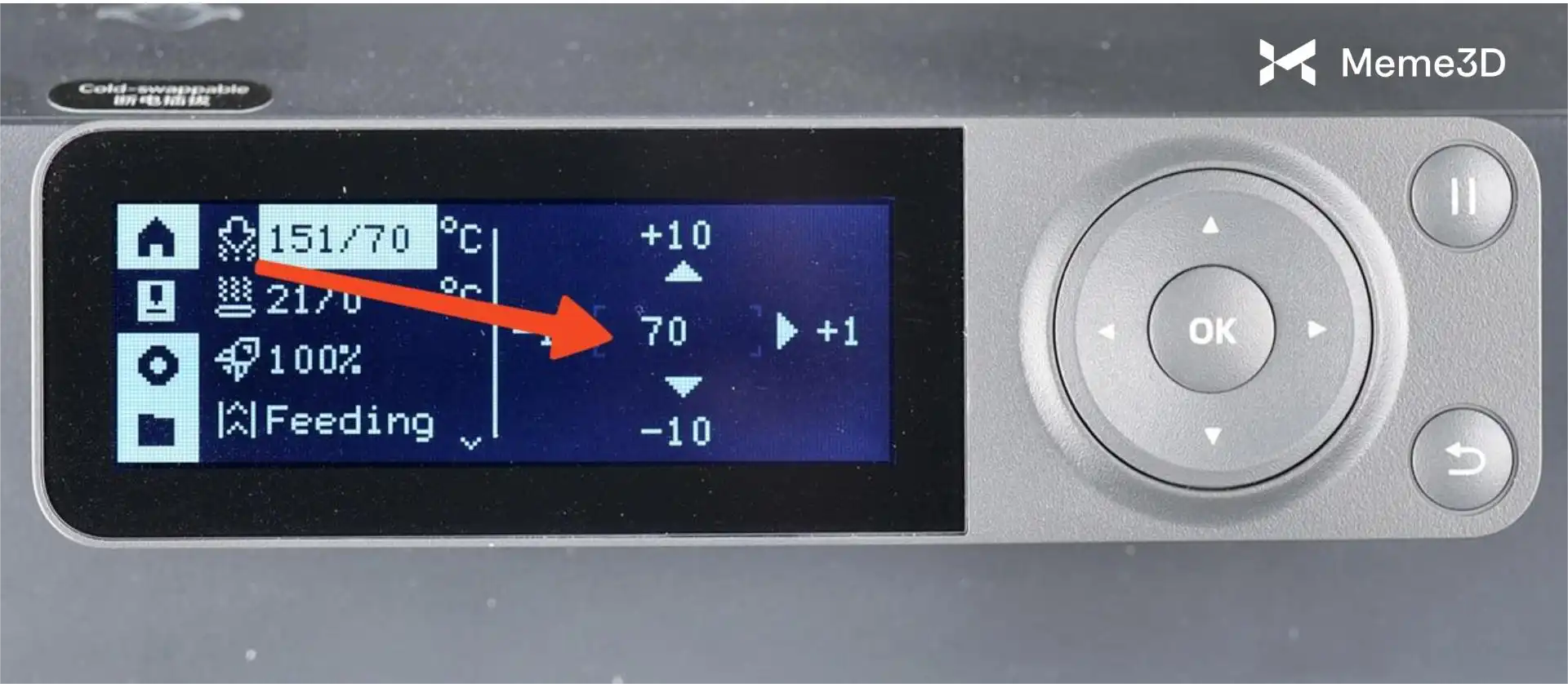 Khi sợi nhựa đạt đến nhiệt độ cài đặt là 70°C, bạn cần bắt đầu rút sợi nhựa bằng các nút trên màn hình.