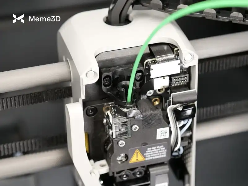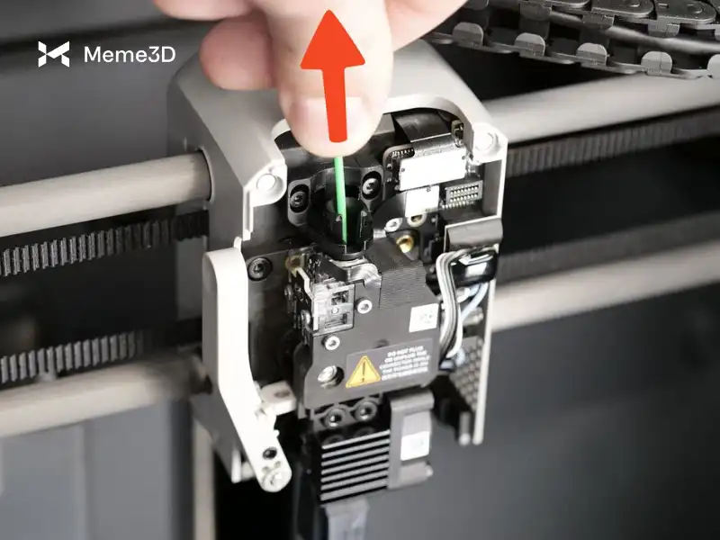 Trong khi đầu phun (hotend) tiếp tục hạ nhiệt để đạt mức nhiệt độ cài đặt là 70°C, hãy tháo nắp che phía trước của cụm đầu in và rút ống dẫn nhựa PTFE ra.