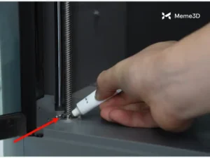 Tiếp theo, bôi trơn các ổ trục trục Z. Như hình minh họa bên dưới, thêm dầu bôi trơn vào các ổ trục ở phía dưới của ba vít me dẫn hướng. Nếu có các hạt sợi nhựa hoặc mảnh vụn ở đáy, hãy lau sạch chúng bằng vải không xơ.