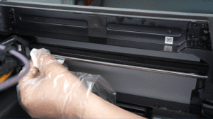 Tiếp theo, lau sạch trục X dọc theo toàn bộ chiều dài, đảm bảo loại bỏ hoàn toàn cặn dầu, bụi bẩn hoặc mảnh vụn. Trong khi thực hiện bước này, kiểm tra dây đai trục X xem có bám bẩn hoặc cặn bám hay không. Nếu dây đai trông bẩn, hãy nhẹ nhàng làm sạch chúng bằng vải không xơ để tránh làm hỏng bề mặt hoặc để lại sợi vải.