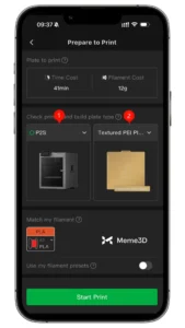 Tiếp theo, bạn cần kiểm tra kiểu máy in và loại bàn in được lắp đặt trên máy in của mình. Trong ví dụ này, đó là máy in P2S và bàn in PEI có bề mặt nhám . Trước khi in, hãy đảm bảo bàn in sạch sẽ nếu cần thiết và luôn sử dụng bàn in tương thích với loại sợi in bạn đã chọn để đạt được kết quả tốt nhất.