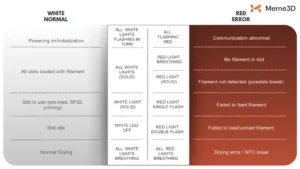 Những đèn này được thiết kế để giúp bạn nhanh chóng biết được có vấn đề gì không. Nếu bạn thấy đèn đỏ nhấp nháy hoặc sáng liên tục, bước đầu tiên luôn là kiểm tra đường dẫn dây tóc và cáp AMS. Để xem danh sách đầy đủ các kiểu hiển thị LED và ý nghĩa của chúng, hãy xem Hướng dẫn trạng thái LED của Bambu . Tham khảo biểu đồ bên dưới để tra cứu nhanh về hoạt động của đèn LED: