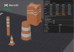 Để minh họa điều này, chúng ta sẽ lấy ví dụ về ba hình nón giao thông khác nhau. Tất cả đều sử dụng sợi nhựa từ cùng một bộ – màu cam, trắng và đen – vì vậy chúng ta có thể kỳ vọng rằng việc gom chúng lại trên một bàn in duy nhất sẽ tiết kiệm vật liệu thừa. Tuy nhiên, thực tế cho thấy, việc gom các hình nón này lại có tác dụng ngược lại và làm tăng đáng kể lượng vật liệu thừa.
