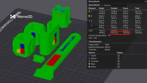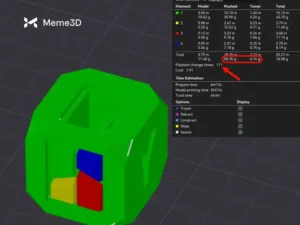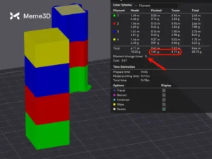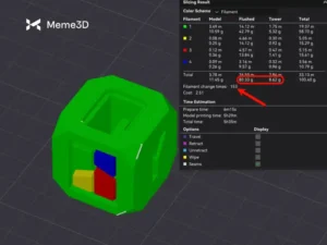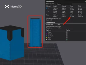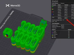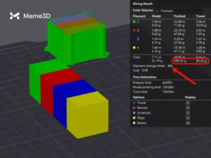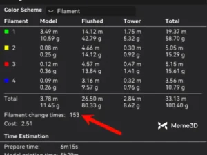 Chúng ta sẽ lấy ví dụ trước đó về một khối lập phương Bambu nhiều màu với tổng cộng 4 màu. Ở độ cao lớp 0,2mm, ta có thể thấy rằng Thời gian thay đổi sợi in hiển thị tổng cộng 153 lần thay đổi, tương ứng với 89 gram sợi in bị lãng phí.