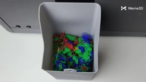Sợi nhựa đã được làm sạch này được đùn ra ở khu vực bên cạnh bàn in, sau đó vật liệu được tách ra khỏi vòi phun và dẫn ra xa khỏi khu vực in.