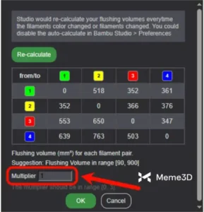 Bambu Studio sử dụng thuật toán để tự động tính toán lượng dung dịch cần thiết để xả nhựa trong quá trình thay sợi in mới. Như đã đề cập ở trên, màu sắc và đặc tính vật liệu là những yếu tố chính được sử dụng để tính toán lượng nhựa xả mặc định.