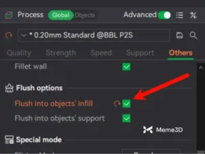 Phần lấp đầy bên trong của mô hình hầu như luôn được bao phủ bởi lớp vỏ ngoài của chi tiết. Do đó, trong nhiều trường hợp, chúng ta có thể sử dụng cài đặt “Đưa sợi nhựa vào phần lấp đầy của đối tượng” để chuyển hướng sợi nhựa lẽ ra sẽ được đẩy ra ngoài để in phần lấp đầy không nhìn thấy được.