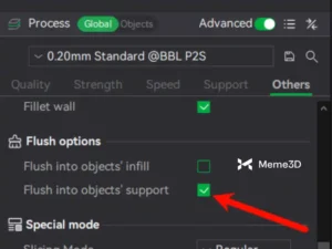 Vì phần hỗ trợ (support) của mẫu in sẽ được gỡ bỏ sau khi in xong, nên nó có thể được tận dụng để in bằng lượng nhựa xả (flush) khi chuyển màu. Đối với những mẫu in có diện tích hỗ trợ lớn, việc kích hoạt tùy chọn này có thể cắt giảm đáng kể lượng nhựa thừa và rút ngắn thời gian in ấn.