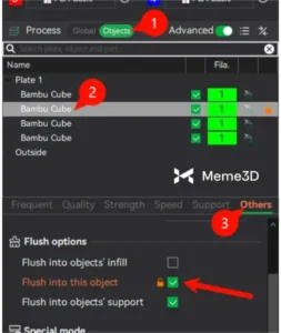 Tùy chọn “Xả vào đối tượng này” chỉ có thể truy cập được khi chọn ít nhất một đối tượng trong tab Quy trình > Đối tượng. Điều này là do tùy chọn này phải được áp dụng cho ít nhất một đối tượng khi có thêm một đối tượng đa vật liệu khác có sự thay đổi sợi in gây ra hiện tượng xả.