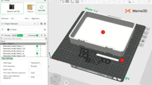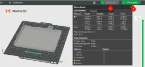 Giờ đây, tất cả các tấm đã được chuẩn bị trong Bambu Studio, đã đến lúc bắt đầu in. Không có thứ tự cụ thể nào mà các mô hình phải được in, nhưng chúng ta sẽ bắt đầu với nắp hộp. Chọn tấm bạn muốn in và nhấp vào Cắt lát mô hình (1). Khi bản xem trước trông chính xác, hãy nhấp vào Gửi đến máy in (2).