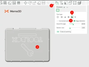 Chọn công cụ tô màu (hoặc nhấn N) (1) sau đó kích hoạt công cụ “Tô màu” (2) và đảm bảo chọn “Phát hiện cạnh” (3). Sau đó, di chuột qua bề mặt của hộp, và đường viền văn bản sẽ xuất hiện (4).