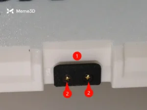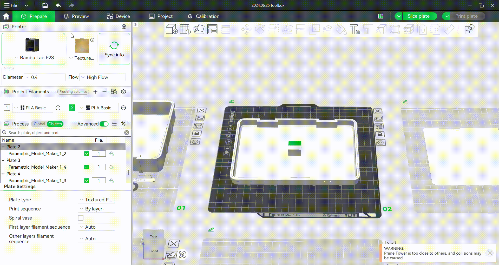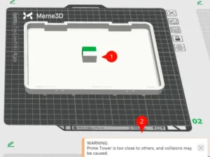 Bambu Studio tự động tạo một tháp chính để xử lý các thay đổi màu sắc. Một cửa sổ cảnh báo (1) sẽ xuất hiện nếu tháp chính (2) va chạm với đối tượng. Để giải quyết vấn đề này, hãy nhấp vào tháp chính và di chuyển nó đến một khu vực trống. Bạn cũng có thể cần dịch chuyển các đối tượng sang một bên để tạo đủ không gian. Vì bản in của chúng ta khá lớn, chúng ta sẽ thêm một tấm bổ sung và tách hai nửa của hộp.