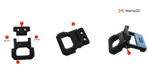 Tiếp theo, chúng ta hãy lắp ráp các bản lề phía sau. Mỗi bộ bản lề gồm hai phần giữa (1) và hai phần bên (2). Lắp ráp chúng bằng bốn vít tự ren M1x8 (3). Đảm bảo rằng các vít được luồn qua các lỗ (4) trên các phần bên sao cho đầu vít nằm ẩn bên trong. Không luồn vít từ phía lỗ thông thường (5).
