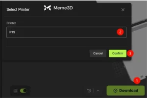 Sau khi bạn hài lòng với thiết kế, hãy nhấp vào Tải xuống (1) và sau đó chọn máy của bạn (2). Tại thời điểm viết bài này, P2S chưa được bao gồm trong dự án, nhưng việc chọn P1S sẽ hoạt động như một lựa chọn thay thế. Cuối cùng, nhấp vào Xác nhận (3) và lưu mô hình vào máy tính của bạn.