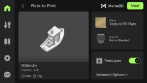 Bạn cũng có thể bật chế độ TimeLapse nếu muốn tạo video về bản in của mình. Sau khi xác nhận, hãy nhấn Tiếp theo và quá trình in sẽ bắt đầu.