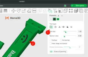 Trong tab Sợi, bạn có thể xem các màu sợi có sẵn cho AMS 2 Pro (1). Sau đó, chọn một công cụ tô màu (2) để bắt đầu tô màu cho các phần khác nhau của mô hình.