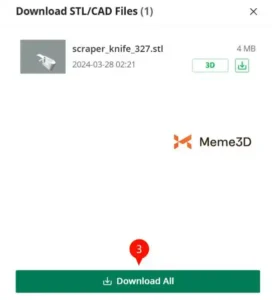 Một cửa sổ bật lên sẽ xuất hiện, hãy nhấp vào “Tải xuống tệp STL/CAD” (2).
