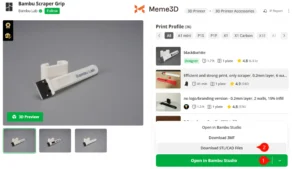 Mở mô hình dụng cụ cạo trong Bambu Studio bằng cách điều hướng đến mô hình tay cầm dụng cụ cạo Bambu trong Makerworld , sau đó cuộn xuống nút màu xanh lá cây “Mở trong Bambu Studio” và nhấp vào mũi tên nhỏ bên phải (1).