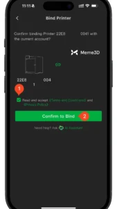 Sau khi quét xong, màn hình này sẽ hiển thị trong Bambu Handy, nơi bạn có thể xác nhận quá trình liên kết. Đọc và chấp nhận các điều khoản và điều kiện, sau đó nhấn Xác nhận để liên kết.