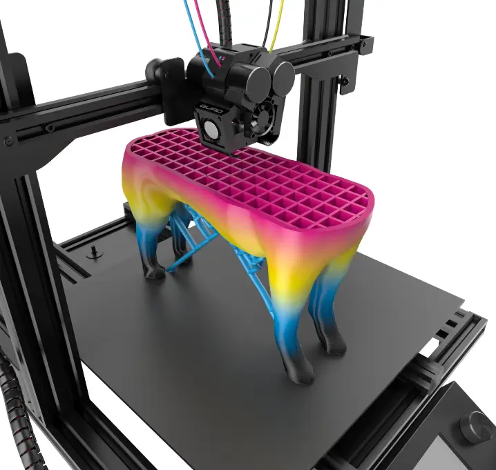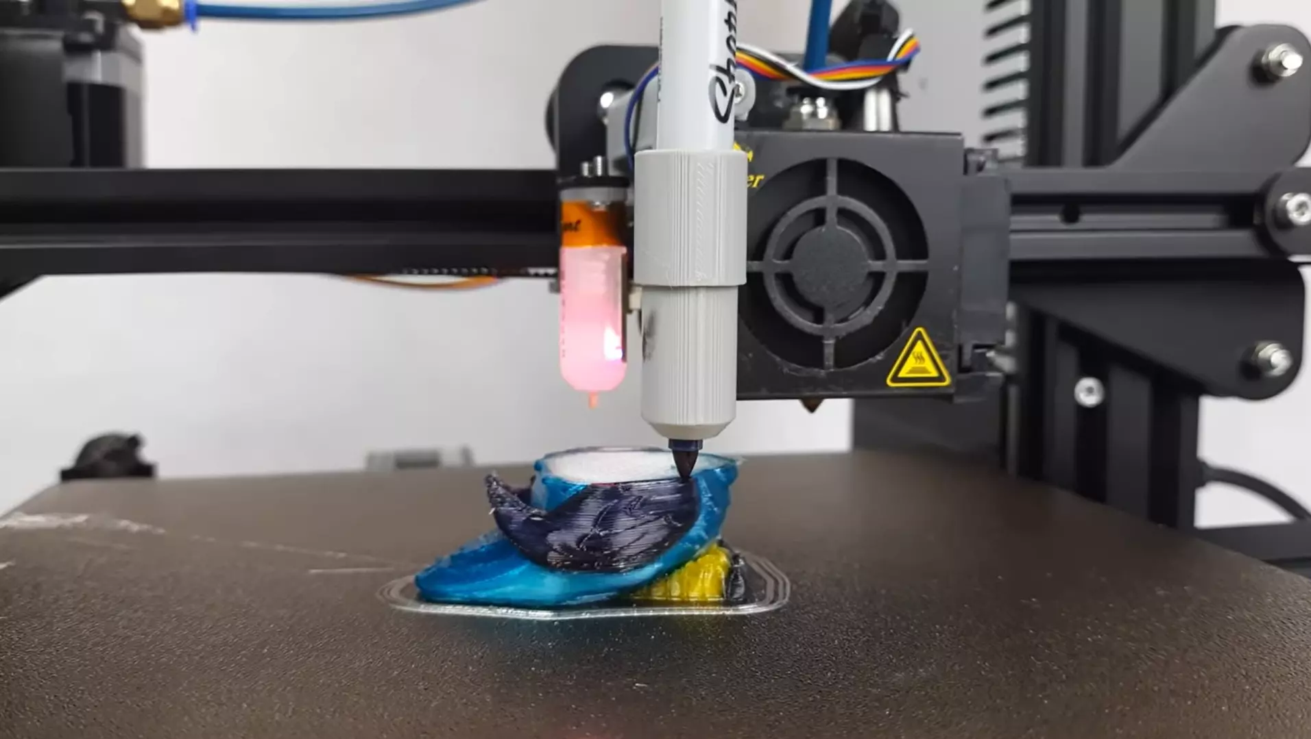 Máy in 3d FDM pha trộn màu sử dụng một đầu phun duy nhất, thiết lập nhiều máy đùn. Điều này có nghĩa là bạn có thể in với nhiều màu hoặc nhiều cách pha trộn. Sự pha trộn xảy ra ở đầu nóng của đầu in.