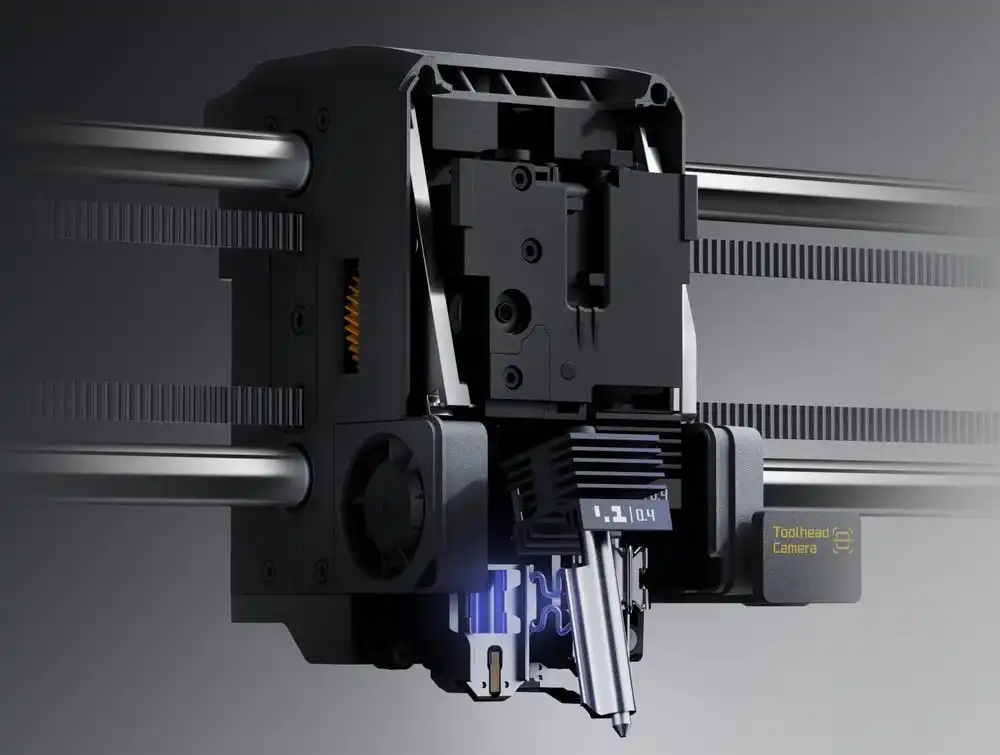 Bộ đùn chính (nằm trong đầu in) đảm nhận việc kiểm soát dòng chảy chính xác. Bộ đùn phụ (Gắn phía trên bảng điều khiển phía sau): Đóng vai trò là bộ đùn từ xa, nó đẩy sợi nhựa từ bộ đệm đến đầu in thông qua ống dẫn PTFE, giúp tiết kiệm không gian đầu in một cách hiệu quả và tối đa hóa thể tích in khả dụng.