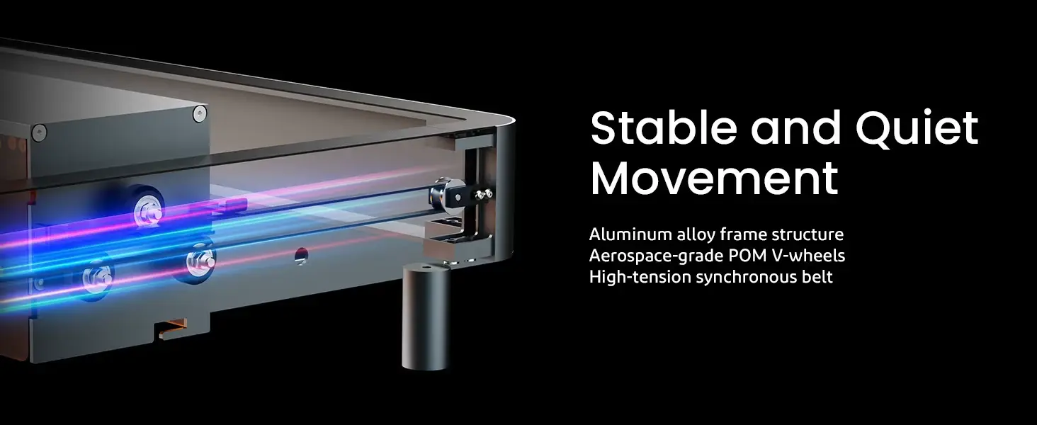 Khung máy được cấu tạo bằng hợp kim nhôm cho độ bền và ổn định cao, đặc biệt khi vận hành ở tốc độ cao. Động cơ điều khiển im lặng chất lượng cao giúp giảm độ rung và tiếng ồn khi chạy. Bánh xe chữ V POM cấp hàng không vũ trụ cực kỳ yên tĩnh, độ chính xác cao và chống mài mòn, trong khi hai hàng bánh xe chữ V 3 + 3 của trục Y, kết hợp với ray trượt rãnh chữ V và độ căng cao vành đai đồng bộ, đảm bảo chuyển động ổn định, yên tĩnh và chính xác của mô-đun laser.