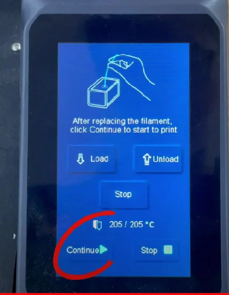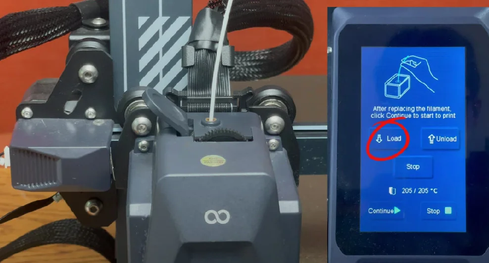 Trên màn hình điều khiển, nhấn nút “LOAD”. Dừng lại Khi bạn thấy đoạn nhựa mới được đẩy ra đều từ đầu in, nhấn nút “STOP”