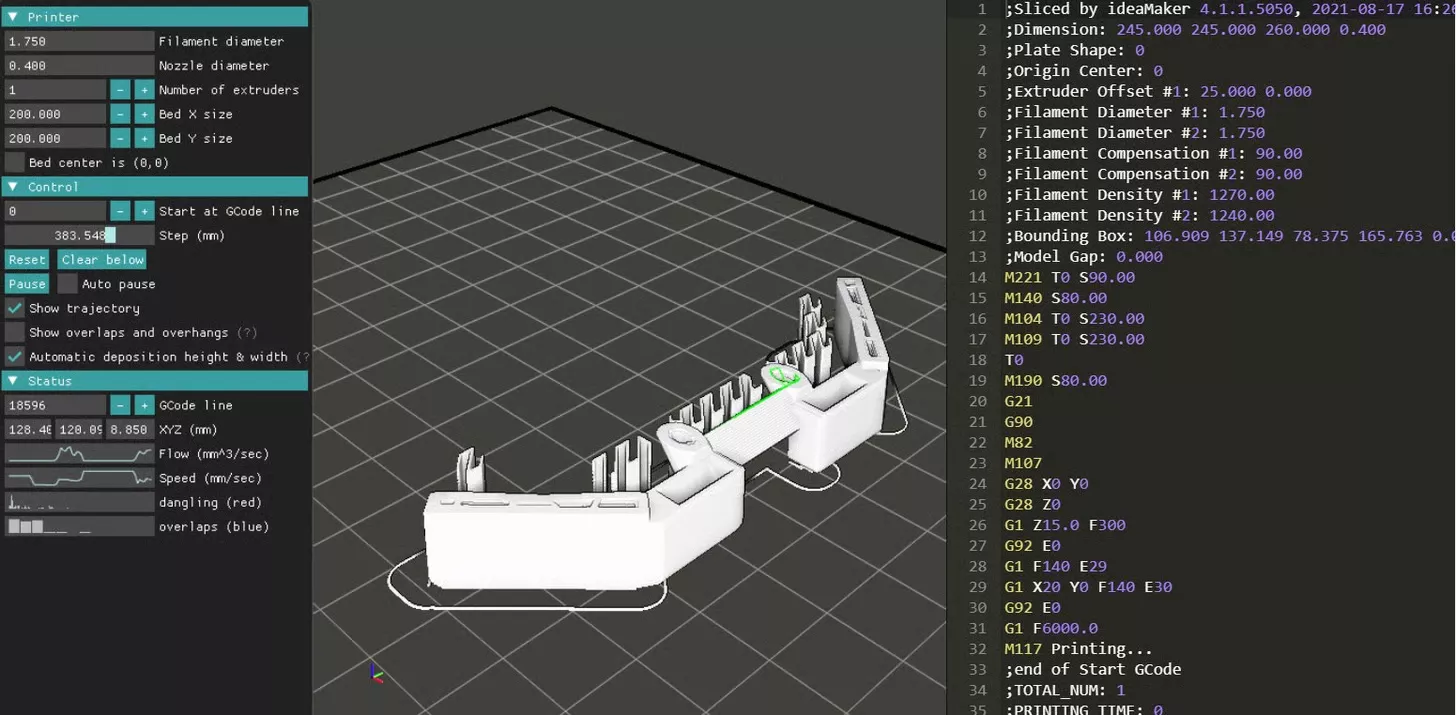 Chế độ mô phỏng 3D không tốt, Nhưng khi chỉ quan tâm đến chế độ xem 2D và mã G-code. Bạn có cái nhìn rõ ràng vô cùng về từng lớp in của bạn. Hai thanh trượt cho phép bạn di chuyển từ lớp này sang lớp khác và theo dõi chuyển động của đường đi công cụ theo trình tự. Chế độ xem mã G cung cấp toàn bộ văn bản của tệp, cho phép bạn xem xét từng lệnh cụ thể được gửi đến máy in của bạn.